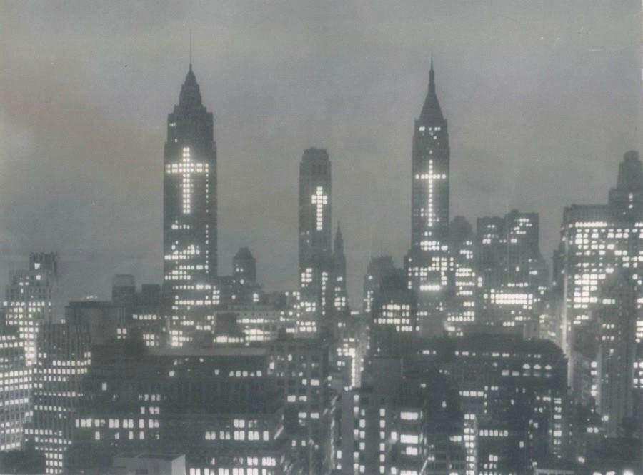Repare que essa foto foi publicada originalmente em 31 de março de 1956, exatamente dias antes da Páscoa, que foi em 1 de abril. Isso significa que bem antes da Páscoa a Cidade de Nova Iorque e seus prédios mais importantes já estavam celebrando Jesus Cristo.